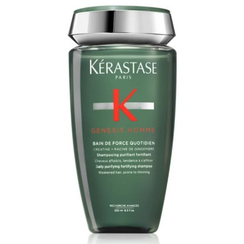 Склад: креатин – зміцнює внутрішню структуру волосся, покращуючи його механічні властивості, а також забезпечує захист волосся від пошкодження внаслідок дії високих температур й ультрафіолетового випромінювання корінь імбиру – захищає від негативних зовнішніх впливів, підтримує оновлення клітин волосся й стимулює шкіру голови Kérastase Genesis Homme Bain de Force Quotidien - зміцнюючий шампунь для чоловіків. Він бореться з випаданням волосся і підходить для щоденного використання.