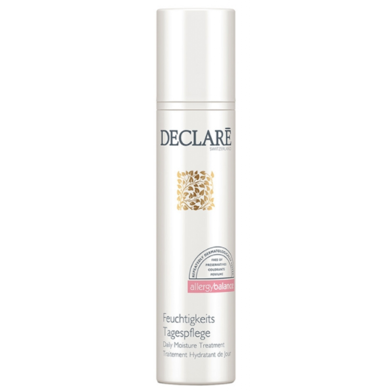 Дневной увлажняющий Крем Declare Allergy Balance Daily Moisture Treatment для сверх чувствительной кожи Интенсивной увлажняющий дневной крем для свежей и сияющей кожи. Содержит активный комплекс Defensil на основе растительных экстрактов. Высокоэффективные растительные экстракты усиливают естественную защитную функцию кожи, что помогает коже бороться с ежедневными стрессовыми факторами. Крем эффективно успокаивает и заботится о коже, укрепляет естественный гидролипидный барьер эпидермиса и снижает чувствительность кожи. Защищает от стрессовых воздействий окружающей среды, агрессивных свободных радикалов и старения кожи, питает. Declare Allergy Balance Daily Moisture Treatment, гармонизирует и улучшает общий баланс кожи, помогает уменьшить аллергические реакции и чрезмерную чувствительность.