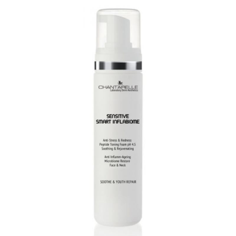 Антистресова заспокійлива пептидна тонізуюча піна рН 4,5 проти почервоніння, запалень та старіння, омолоджує, відновлює мікробіом, для обличчя та шиї чутливої шкіри.