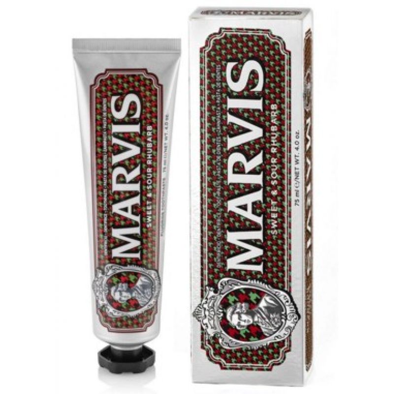 Чудова паста неймовірної ніжної, кремової текстури і смаком кисло-солодкого ревеню і м'ятною ноткою. Зубні пасти Marvis володіють відмінними властивостями, що очищають. До складу пасти входять фтор та ксиліт, це захищає зуби від виникнення карієсу. А також делікатні абразивні речовини, які дбайливо видаляють зубний наліт і полірують емаль, не пошкоджуючи її. Рекомендується тим, які дуже любить каву і дуже часто її п'є.
