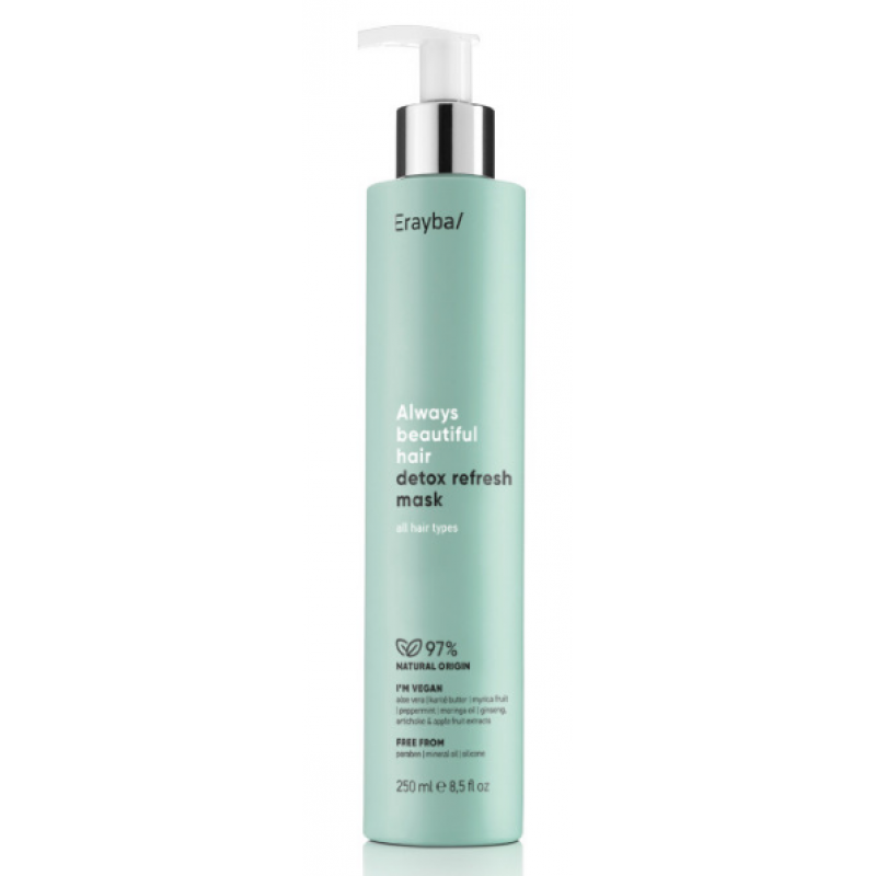Erayba ABH Detox Refresh Mask Маска-детокс – веганська маска з натуральними активними компонентами. Рекомендується всім типів волосся. Освіжає волосся та захищає його від шкідливого впливу навколишнього середовища. Кондиціонує та зволожує волосся, полегшує розчісування, відновлює волосся зсередини. Забезпечує омолоджуючий та антиоксидантний ефект.
