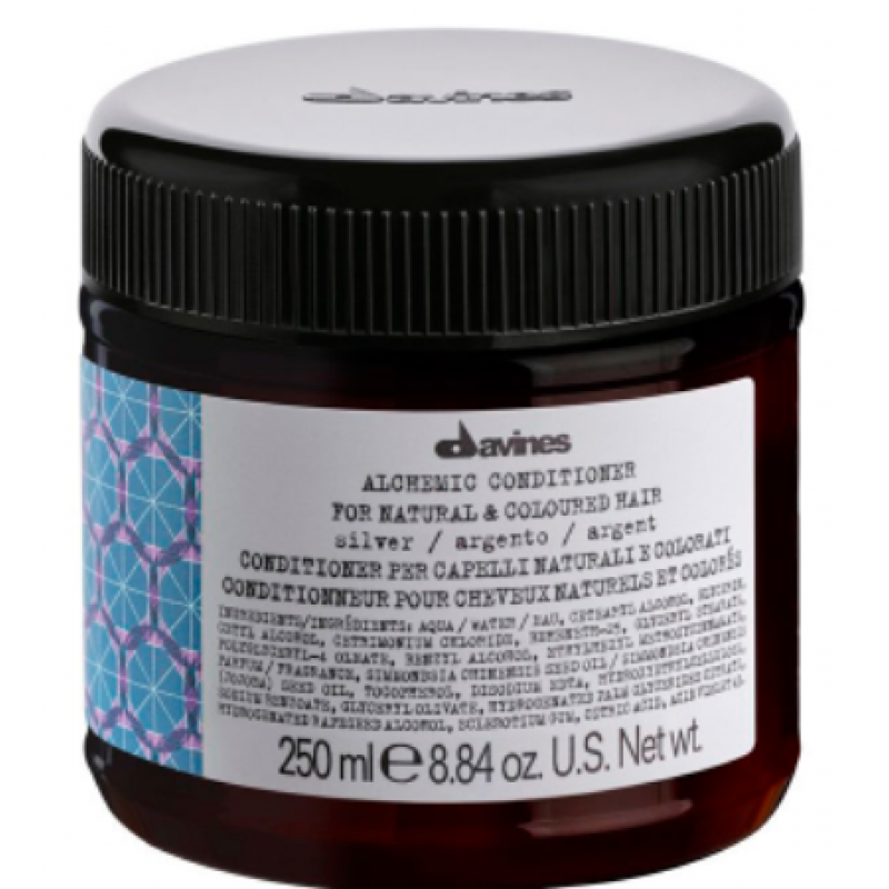 Davines Alchemic Conditioner For Natural And Coloured Hair Silver - Кондиционер Алхимик для натуральных и окрашенных волос «Серебро» - Оттеночный кондиционер, усиливающий холодный платиновый блонд и деликатно тонирующий седые волосы. Устраняет нежелательную желтизну осветленных или седых волос. Питание и защита для окрашенных волос. Помогает сохранить тёмно-коричневые чёрные оттенки Гидролизированные молочные протеины, хитозан, увлажняющие вещества, витамин Е. Глубоко питает и увлажняет волосы оттенков платинового блонда, осветленные и седые волосы, устраняя нежелательные желтые нюансы. Благодаря маслу жожоба делает их мягкими, шелковистыми и блестящими. Без парабенов и силиконов.