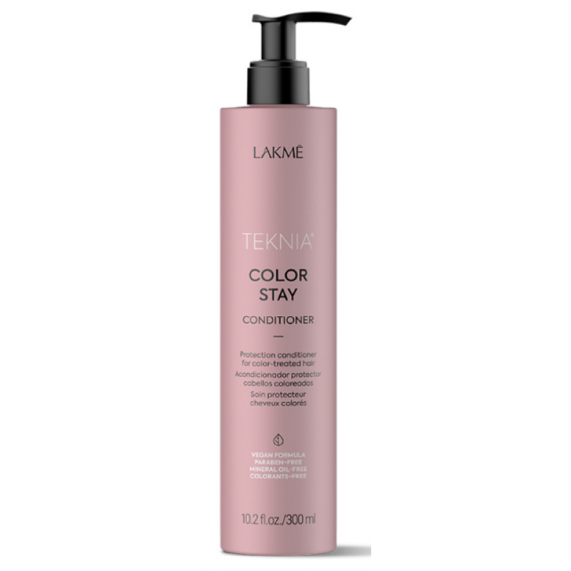 Кондиціонер для фарбованого волосся Lakme Teknia Color Stay Conditioner зберігає колір після фарбування. Така особливість обумовлена кислотним рН, який стуляє лусочки кутикули і, як наслідок, уповільнює втрату пігменту. WAA-комплекс рослинних амінокислот доглядає волосся зсередини. Пасма стають блискучими, м'якими та еластичними. Засіб забезпечує збереження кольору волосся та насиченість відтінку.