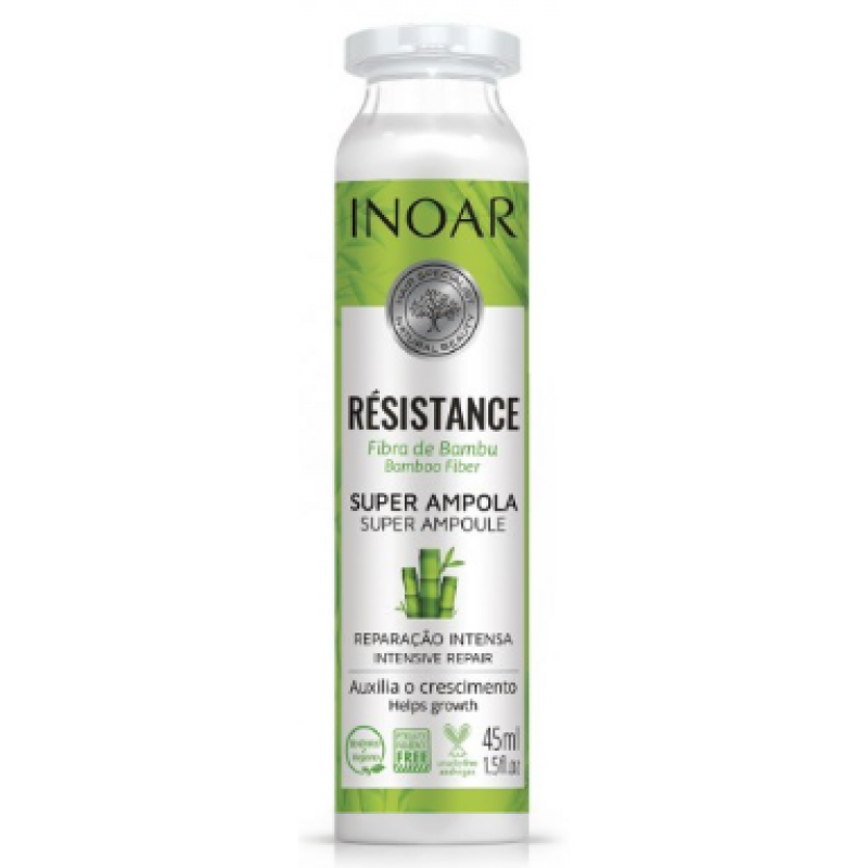 Бамбукова ампула Inoar Resistance Ампула для пошкодженого волосся. Ампула з бамбукового волокна Inoar Résistance сприяє зростанню волосся, зміцнює його та відновлює ослаблене волосся. Inoar Résistance Ampoule Bamboo Fiber омолоджує волокна волосся та відновлює додатково надаючи блиску. Крім того, він пом'якшує дотик і полегшує розчісування.