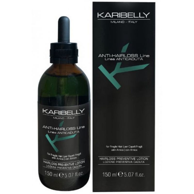 Лосьйон проти випадіння волосся Karibelly - це інтенсивний догляд на основі арніки, кропиви, провітаміну В5 і гідролізованого колагену для запобігання випадінню, інтенсивного живлення і поліпшення стану волосся, інтенсивного живлення і поліпшення кровообігу в перибульбарних капілярах, протидіючи процесу мініатюризації волосяної цибулини.