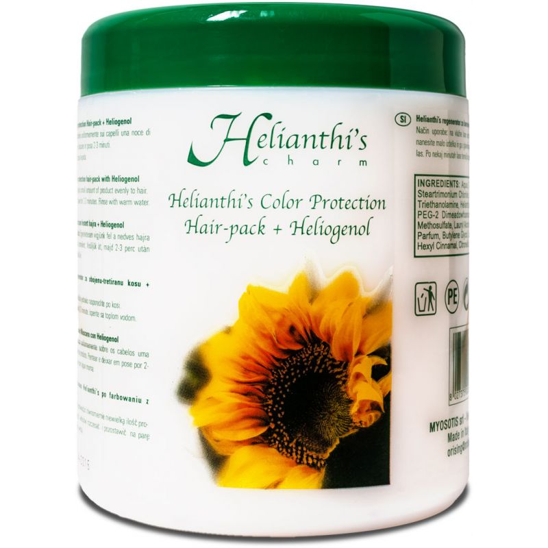 Маска-бальзам "Захист кольору" Orising Helianthi's Color Protection Hair-Pack + Heliogenol є чудовим засобом як догляд за фарбованим волоссям. Композиція з соняшникової олії та екстрактів трав відновлює волосся, живить вологою та надає їм блиску та еластичності. Heliogenolis витягнуті з соняшникової олії, допомагає зберегти колір фарбованого волосся. Продукт перешкоджає передчасному вимиванню кольору та його вигорянню на сонці. Гарантує збереження яскравості та соковитості кольору.