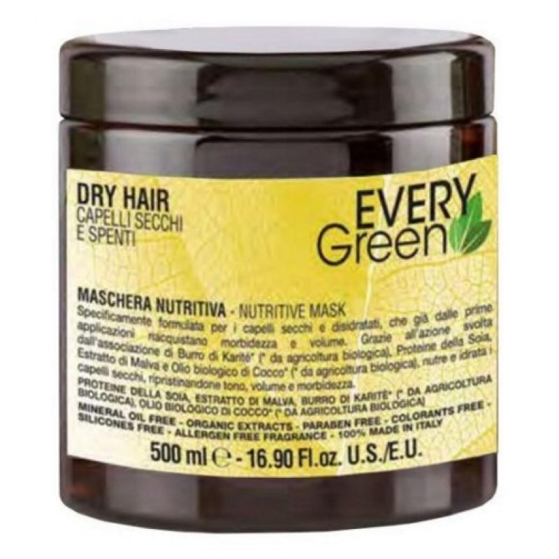 Поживна маска для сухого волосся Dikson Every Green Nutritive Mask спеціально розроблена для сухого, зневодненого волосся. Dikson подбав, щоб маска також підходила волоссю, що втратило свою м'якість і об'єм. Значні покращення стану волосся видно вже після перших застосувань. Основою здорового догляду за сухим волоссям є органічний склад маски EveryGreen: олії солодкого мигдалю та кокосу, екстракт мальви та протеїн сої. Mask Every Green розплутує, живить та зволожує волосся до капілярного волокна. Волосся набуває довгоочікуваного об'єму, відновлюється тон і блиск волосся.
