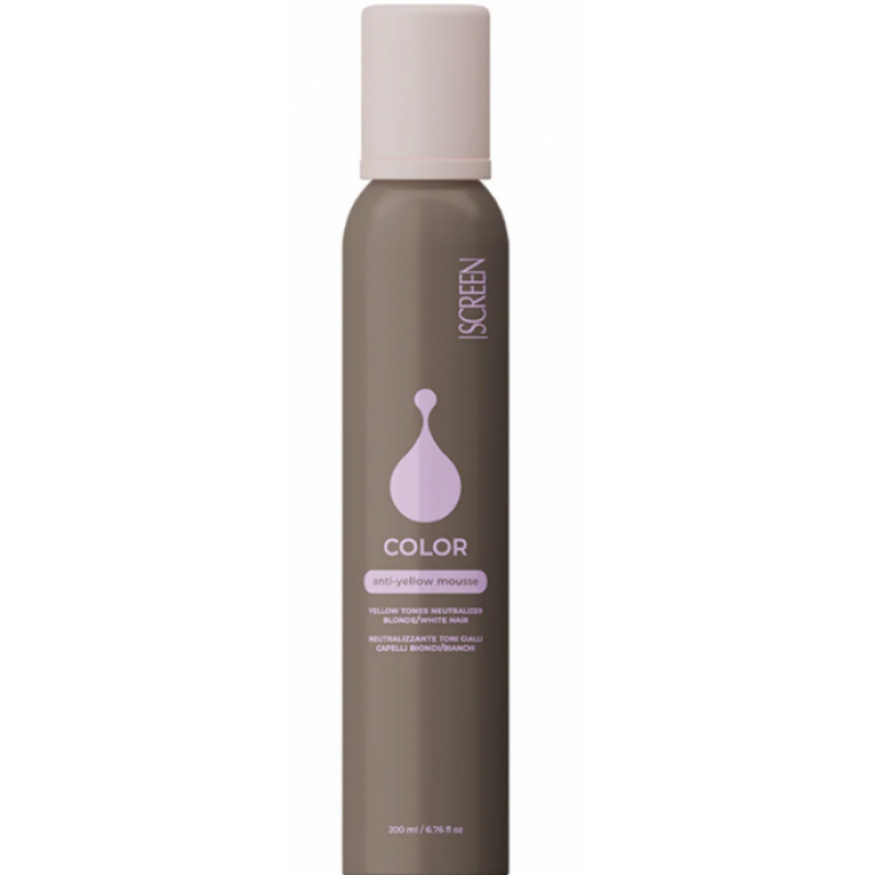 Screen Color Anti-Yellow Mousse — це інноваційна пінка, спеціально розроблена для нейтралізації небажаних жовтих відтінків у світлому, сивому або знебарвленому волоссі. Завдяки вмісту фіолетових пігментів, цей засіб ефективно усуває теплі тони, надаючи волоссю чистий, холодний відтінок.