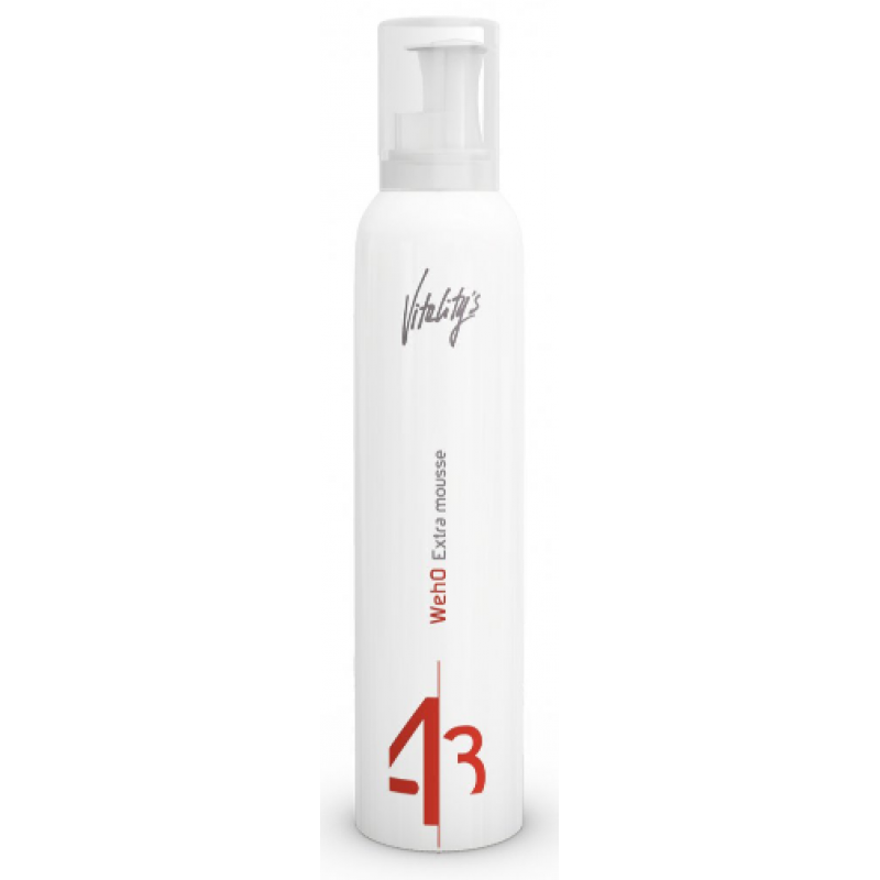 Мус екстрасильної фіксації Vitality's We-Ho Extra Mousse призначений для структурованих укладання, яким потрібна тривала і стійка фіксація. Засіб залишає локони пружними та м'якими, воно зручне у застосуванні та діє без обтяження. Мус легко наноситься на волосся, роблячи його більш пишним, і при цьому не обтяжує його і не робить липкими на дотик.