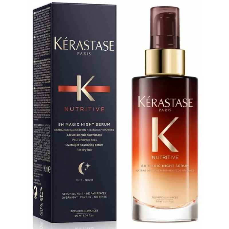 Сироватка для волосся Nutritive 8H Magic Night Serum від бренду Kerastase (Франція, Іспанія) – це інноваційний засіб, який забезпечує захист від дії вільних радикалів. Сироватка залишає на локонах легкий квітково-цитрусовий аромат. Рекомендована для сухого волосся. Склад: вода, циклогексасилоксан, гліцерин, ліналоол, токоферол, пантенол та ін. Спосіб застосування: Нанести сироватку перед сном на сухе або підсушене рушником волосся по всій довжині, приділяючи особливу увагу кінчикам. Не потребує змивання.