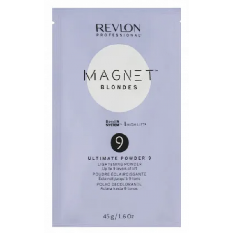 Пудра освітлення Magnet Blondes 9 Ultimate Powder Lightening Powder з професійної лінійки Revlon Professional розроблена для максимальної нейтралізації кольору, ідеального освітлення до 9 рівнів без ризику пошкодження, ослаблення волосся, подразнення шкіри голови.