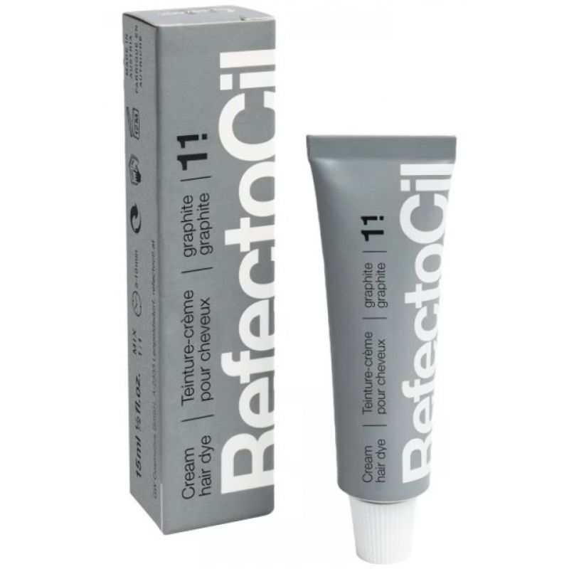 Відтінок № 1.1 graphite (графіт) спеціально розроблений для брів із сивиною. Ця фарба чудово зафарбовує сиве або світле волосся, надаючи їм різні відтінки – від світло-сірого до темно-сірого залежно від тривалості процедури фарбування. Універсальна у використанні. Можливе поєднання з RefectoCil №2.1 (темно-синій) для надання глибини кольору, №3 (натурально-коричневий) для теплих брюнеток. Використовується з 3% рідким або кремовим окислювачем RefectoCil Oxidant.