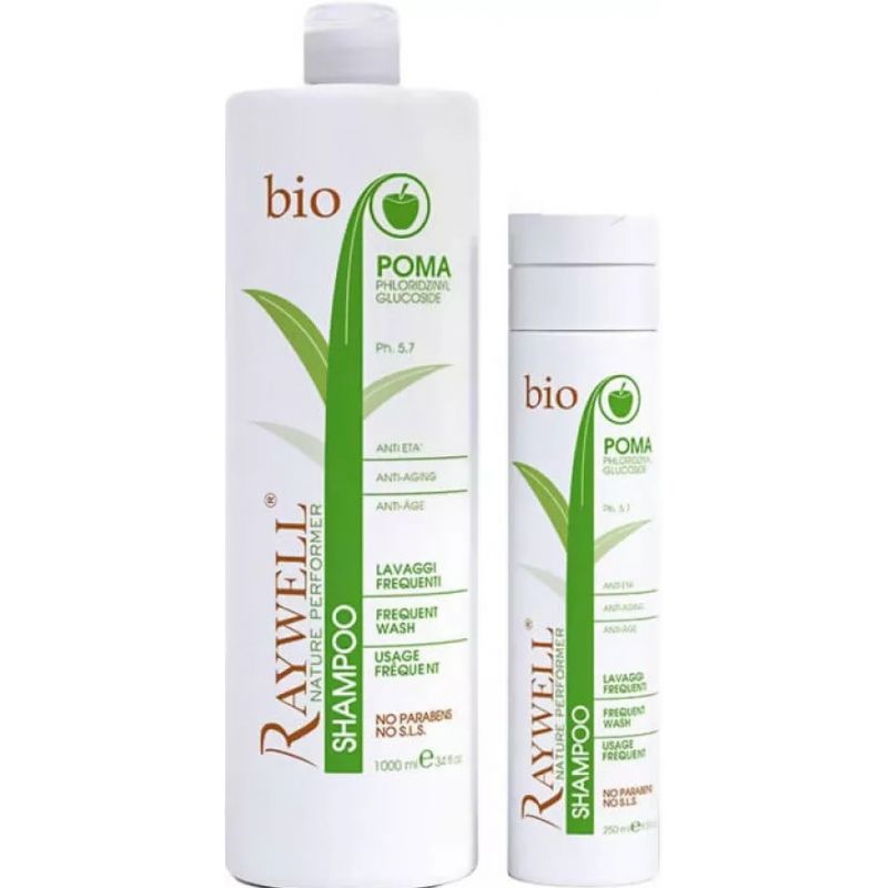 Шампунь для всіх типів волосся та щоденного використання містить стовбурові клітини зеленого яблука та олію камелії. Бореться з ознаками старіння і робить волосся блискучим і шовковистим. Шампунь Raywell BIO POMA створений для щоденного миття усіх типів волосся.