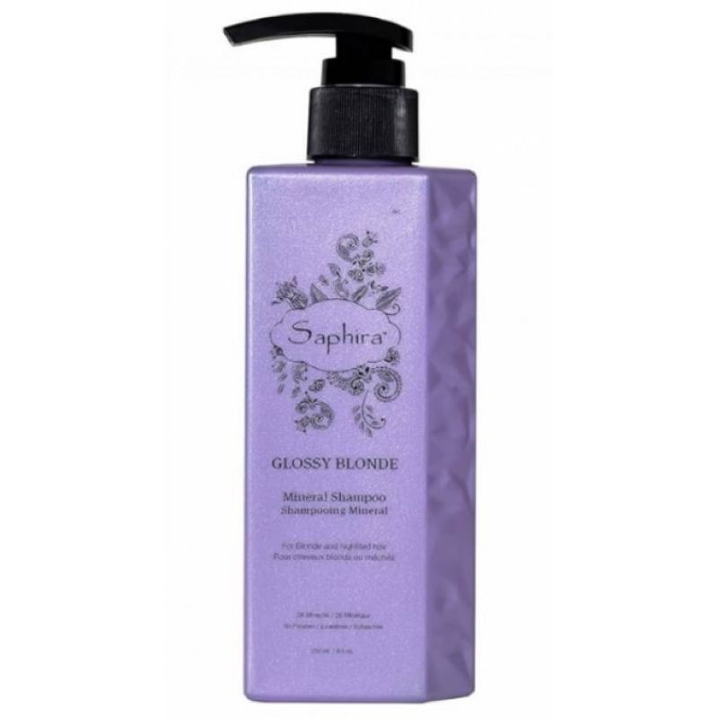 Saphira Glossy Blonde Mineral Shampoo — професійний тонуючий шампунь для догляду за натуральним світлим, освітленим і фарбованим волоссям. Засіб делікатно очищає, ефективно нейтралізує небажані жовті та мідні відтінки й допомагає зберегти чистий, холодний та сяючий блонд між процедурами фарбування.
