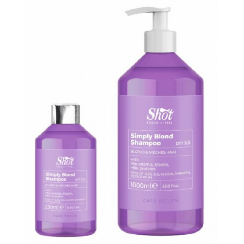 Не містить Sles, силікони та парабени. З олією макадамії, еластином та протеїнами молока. Підходить для повсякденного застосування, навіть для чутливої шкіри голови. Шампунь Shot Care Design Simply Blond з кремовою текстурою спеціально розроблений для освітленого та мелірованого волосся.