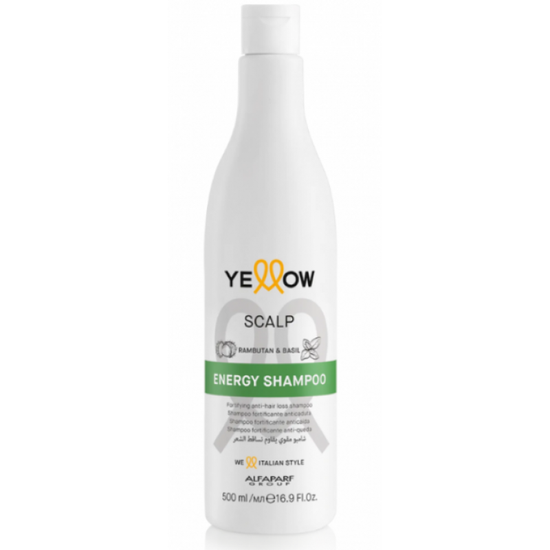 Очищає та стимулює ріст волосся, надає їм об'єму. Підходить для щоденного застосування. Зміцнюючий шампунь проти випадіння волосся Yellow Scalp Energy Shampoo — очищає і стимулює волосся від коренів. Надає об'єму. Містить у своєму складі базилік натурального походження. Його вміст ефірних олій стимулює клітини волосяних цибулин, допомагаючи протидіяти випаданню волосся.
