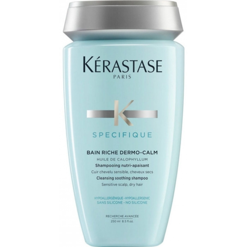 Kerastase Specifique Bain Riche Dermo-Calm Shampoo - шампунь для чутливої шкіри голови та сухого волосся, заснований на ультра ніжній формулі, яка призначена для турботи про пересушену дерму голови. При застосуванні м'якого миючого засобу з першого разу зникнуть неприємні відчуття, і ви відчуєте приємну свіжість.