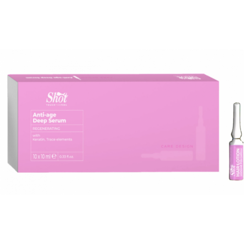 Відновлююча сироватка для волосся Shot Care Design Anti-Age Siero має унікальну формулу, що дозволяє миттєво впливати навіть на сильно пошкоджене волосся. До складу засобу входять кератин для активного відновлення структури, лляна олія для інтенсивного харчування та пом'якшення волосся, комплекс природних мінералів для насичення коренів та стрижня кремнієм, магнієм, цинком, залізом, міддю.