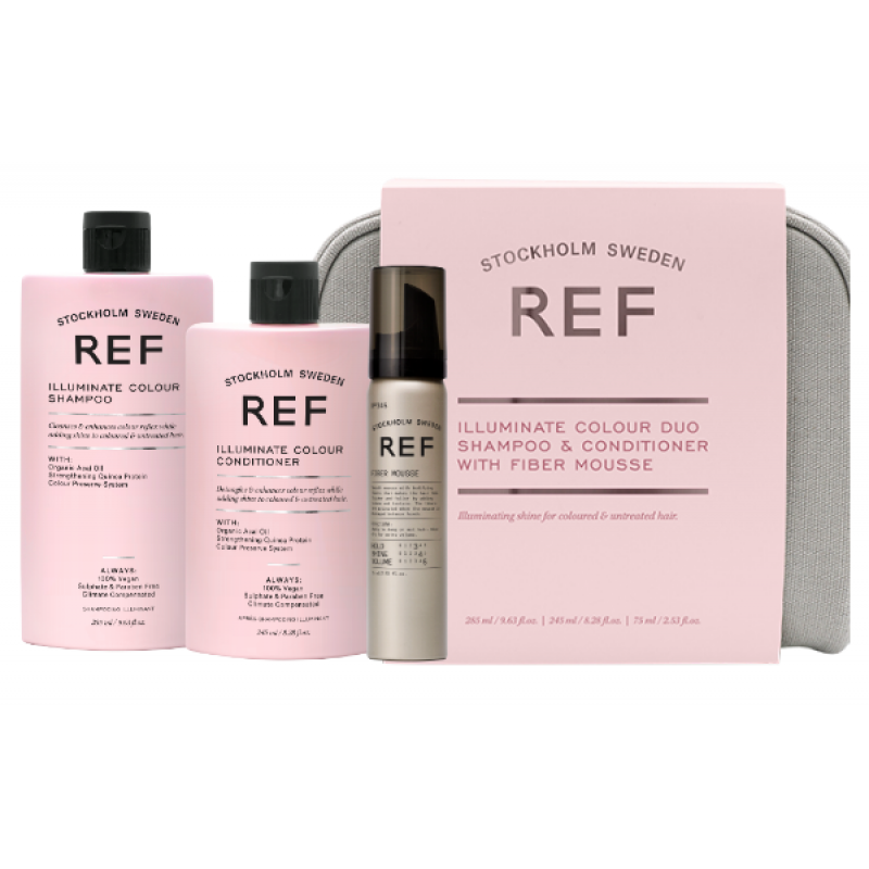 Тревел набір від REF – це завжди приємний подарунок для себе або близьких. До набору входить шампунь (285 мл) і кондиціонер (245 мл) із серії сяючого кольору, а також міні- мус із зміцнюючими волокнами (75 мл).