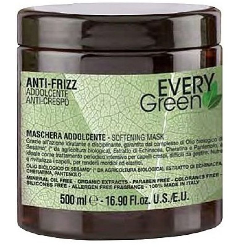 Зволожуюча маска для кучерявого волосся Dikson Every Green Anti-Frizz Softening Mask здатна глибоко зволожувати волосся по всій довжині. Маска EveryGreen живить волосся від коренів до кінчиків, відновлює їх пружність і міцність. До складу маски Anti Frizz входять: кератин, пантенол, екстракт ехінацеї та олія кунжуту. Всі органічні інгредієнти, маска підходить для чутливої шкіри голови. Every Green маска не містить парабенів та силіконів. Завдяки глибокому зволоженню цей інтенсивний догляд ідеально підходить для впертого і неслухняного кучерявого волосся.