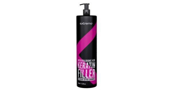 Шампунь Keratin Repair Shampoo від Extremo (країна-виробник – Італія) з гіалуроновою кислотою та кератином у складі очищає локони від забруд..