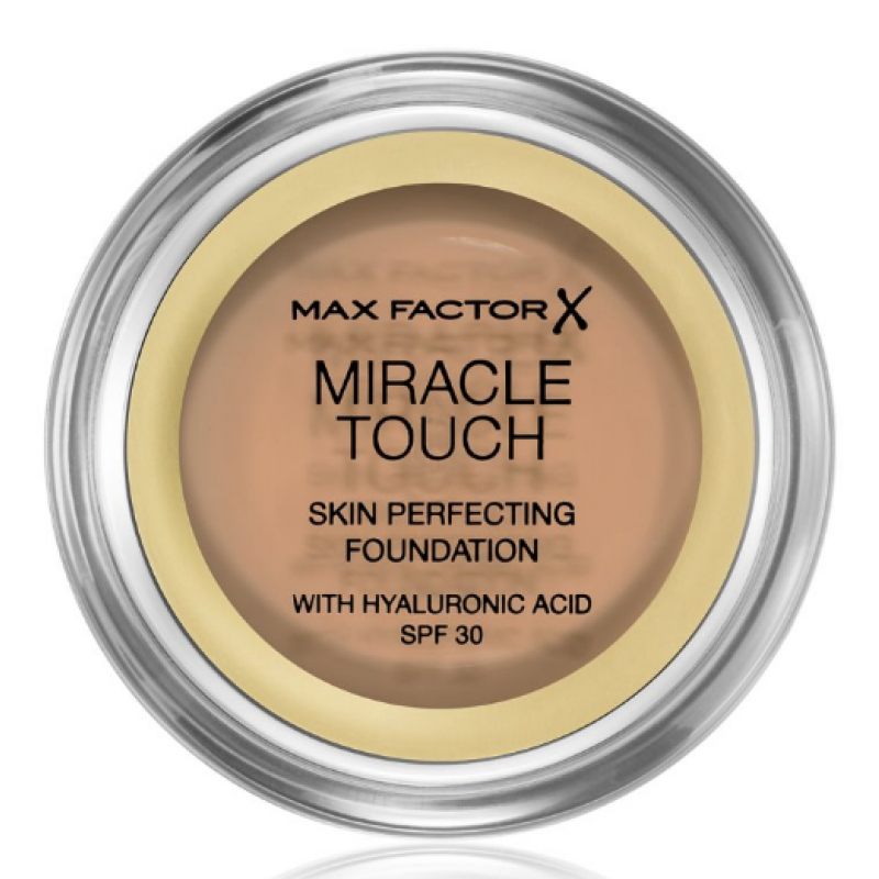 MAX FACTOR Miracle Touch Skin Perfecting Foundation SPF30 - Это Крем-пудра, которая не только скроет недостатки и выровняет тон кожи, но и позволит улучшить ее состояние, даря красоту и уход. Довольно плотная текстура тонального средства при нанесении и распределении ее на поверхности кожного покрова становится невероятно легкой. Это позволяет хорошо и быстро растушевать ее, сделав тон кожи абсолютно ровным всего за считанные минуты. Средство визуально сделает более гладкой поверхность эпидермиса, замаскирует прыщики, покраснения, пигментацию и другие мелкие недостатки. Тональный крем-пудра Miracle Touch не забывает поры и не пересушивает кожный покров, отлично матирует кожу и устраняет жирный блеск. Оно одобрено дерматологами и прекрасно подходит для любого типа эпидермиса.