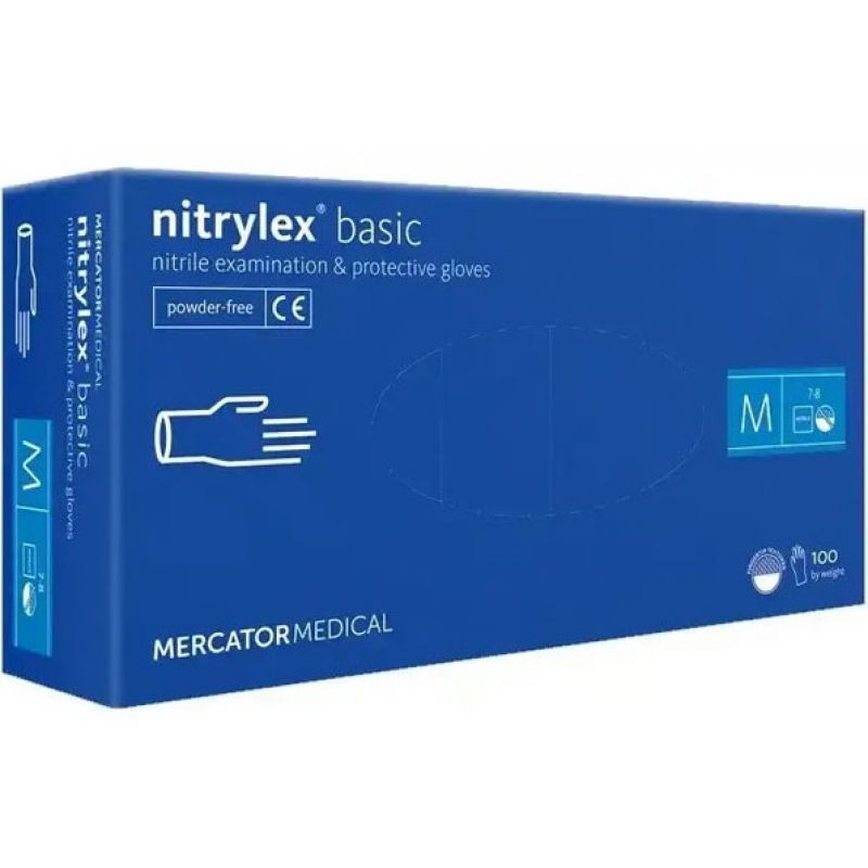 Mercator Medical Nitrylex Basic (Dark Blue) Рукавички нітрилові M (100шт/пач) Нітрилові нестерильні оглядові рукавички текстуровані Nitrylex® PF синього кольору. Текстуровані кінчики пальців гарантують надійне захоплення навіть у вологому середовищі. Цей вид рукавичок виготовлений зі 100% нітрилу (акрилонітрил-бутадієн), матеріал не містить латексних протеїнів і демонструє високий рівень хімічного очищення в тестуванні HPLC водного екстракту.