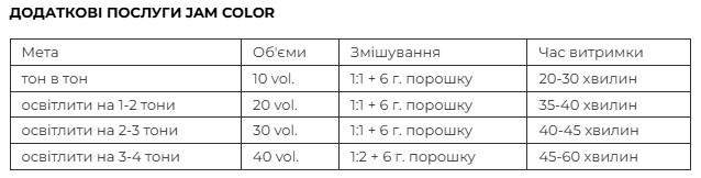 Послуга JAM COLOR Мета: Перманентне фарбування з насиченим ефектом для фарбування та освітлення до 3-4 тонів, а також натуральне зафарбування до 100% сивини. Спосіб застосування: Змішати в неметалевій мисці Water Color + Water-based Developer 10 vol./20 vol./30 vol. в пропорції 1:1 (для суперосвітлювачів або 000 змішати 1:2, використовуючи 40 vol.), потім додати Texture Developer 6 г. Нанести суміш. Час витримки залежить від обраного кисню. Ретельно змийте і після фарбування скористайтеся шампунем і маскою/кондиціонером.