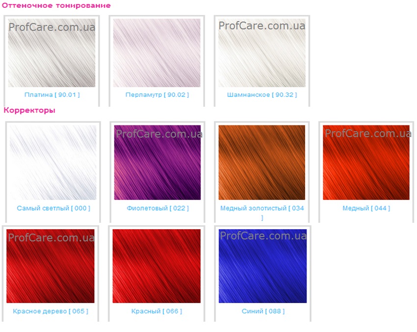 Інтенсифікатори (034/044/065/066/077/088) особливі відтінки з високою відбивною здатністю використовуються для отримання більш інтенсивних відтінків золотистого, мідного, махагону, червоного, фіолетового та синього (попелястого) фарбування. Для корекції кольору додається 1,5-2 см на 50 мл фарби залежно від бажаного результату. Для посилення кольору – 15мл на 50мл фарби. При цьому додатковий окислювач інтенсифікатори не береться. Наприклад: 15 мл інтенсифікатора з 50 мл крем-фарби + 50 мл окислювача 3%, 6%, 9% або 12% залежно від бажаного результату. Для максимально позитивного результату фарбування коректор необхідно ретельно перемішати з бажаним барвником, а потім додати окислювач. Ці пропорції застосовуються здебільшого, але у деяких окремих випадках кількість коректора варіюється т.к. необхідно врахувати агресивність (кількісний вміст хроматичного кольору) небажаного відтінку. Застосовувати фарби необхідно згідно з інструкцією, вкладеною в упаковку.